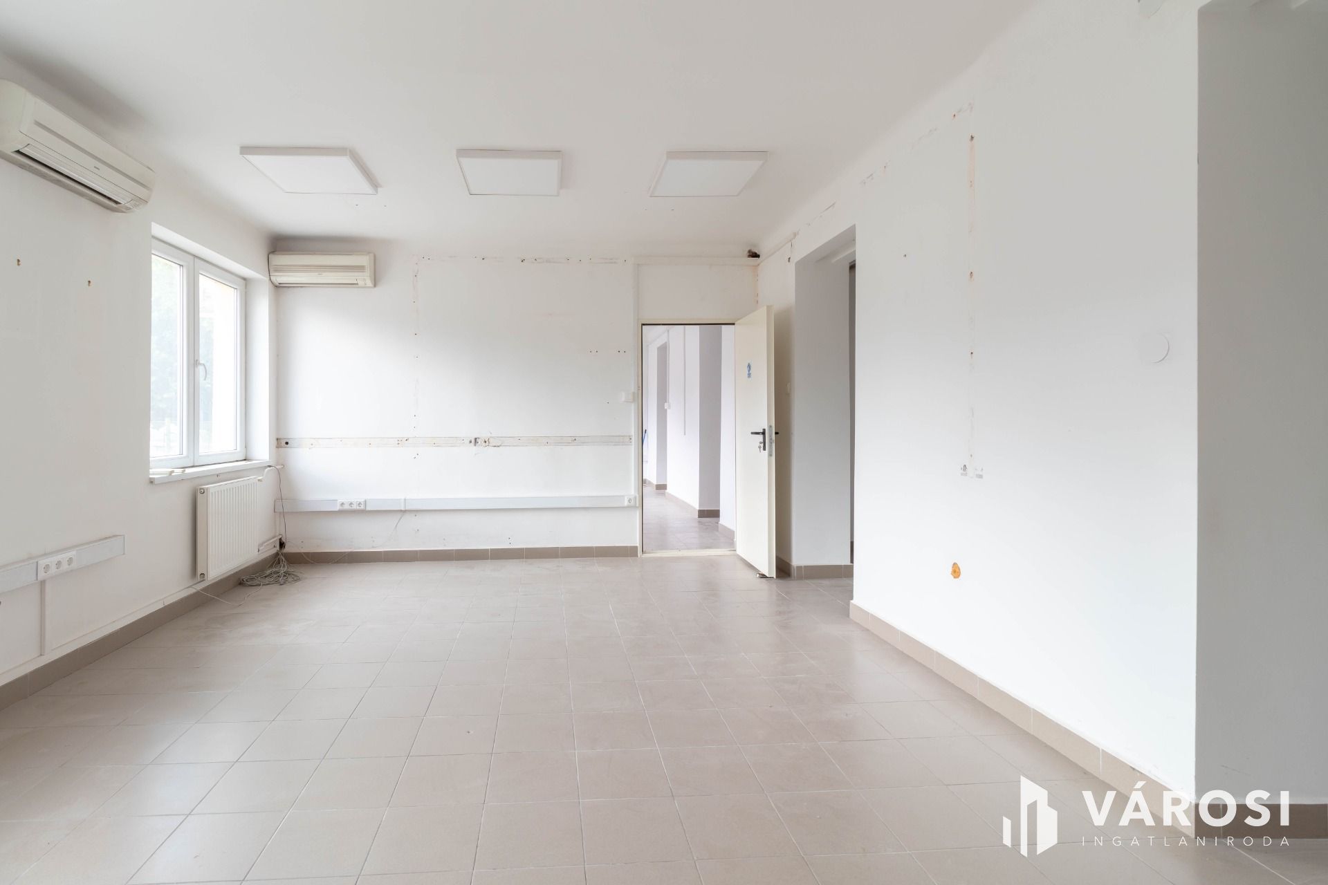 A két, egymásból nyíló, egyenként 25 m2-es helyiségből álló iroda az irodaház földszintjén helyezkedik el. A járólapos padlóburkolat biztosítja a könnyű tisztán tarthatóságot.