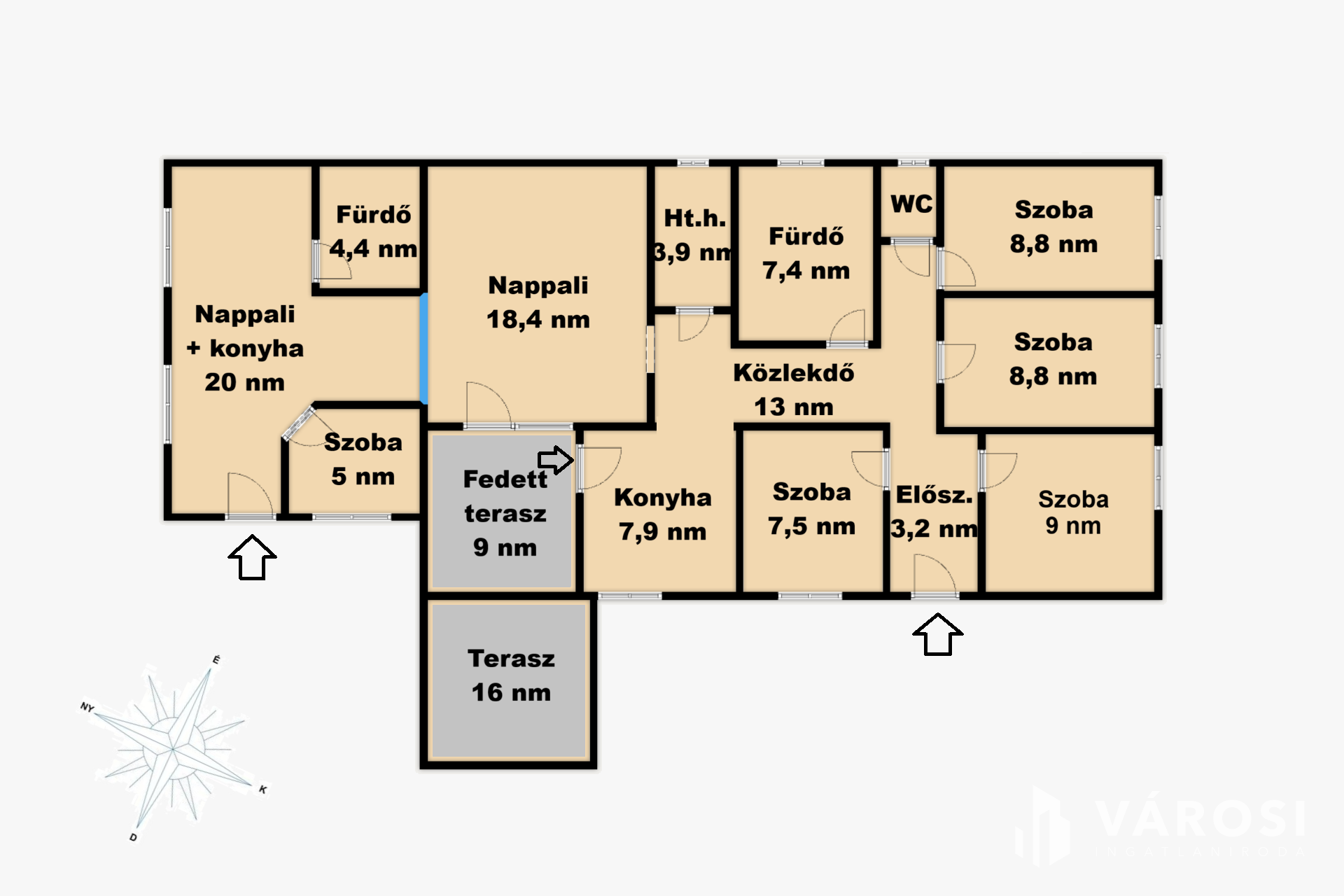 A ház két különálló lakóegységből áll. Az első egységben nappali, konyha, 4 hálószoba, fürdő, WC kapott helyet 90 négyzetméteren. A második lakóegységben, ami a garázs beépítésével készült, konyha, nappali, fürdő és egy félszoba készült a 30 négyzetméteren. A házhoz tartozik egy fedett és egy nyitott terasz is, ami szintén árnyékolható egy kitekerhető napellenzővel.
