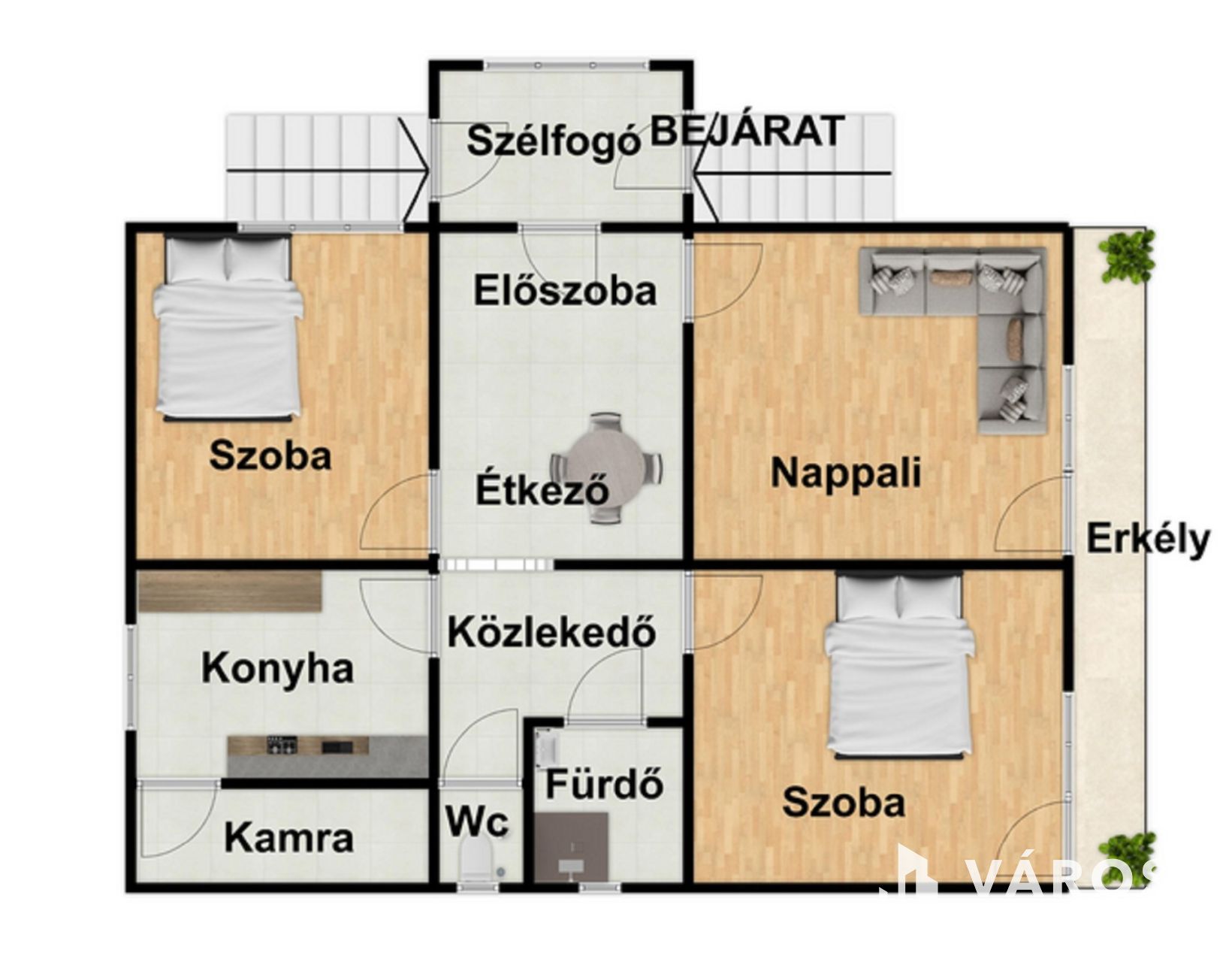 -emeleti lakás(étkező, nappali, 2 lakószoba, konyha, kamra, fürdőszoba, wc és közlekedő)