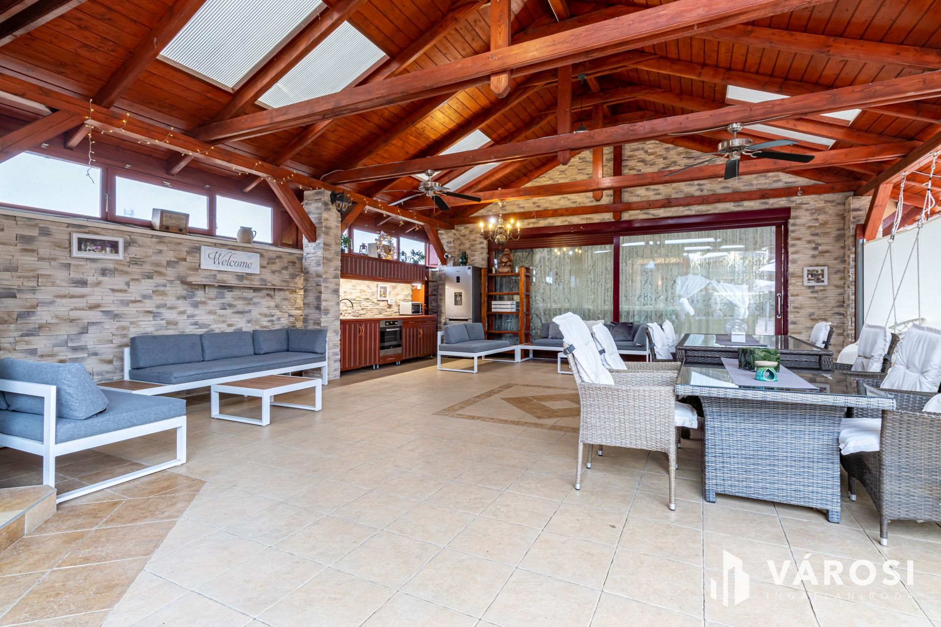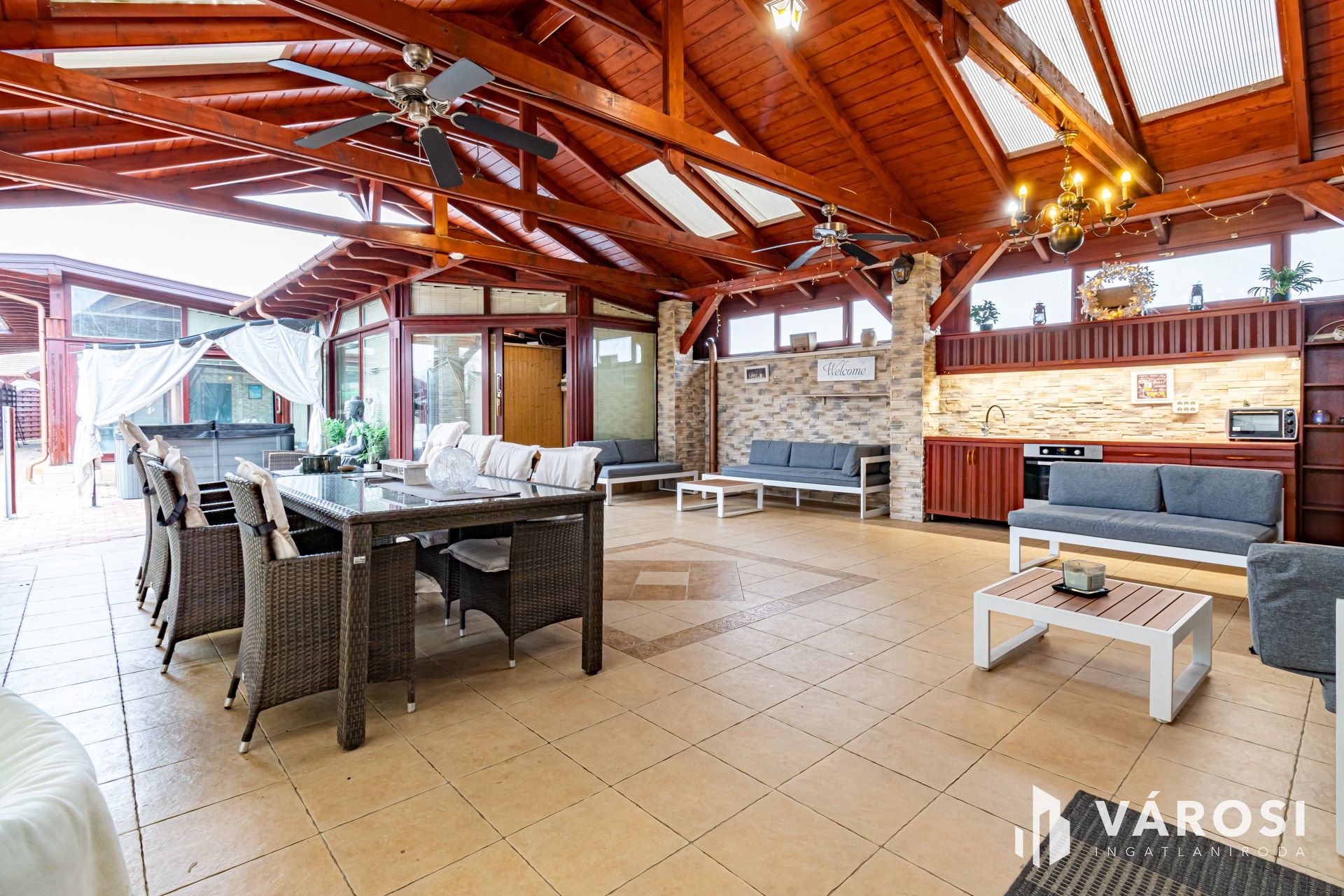 A házhoz rendezett udvar, több autó parkolására alkalmas kerti beálló, elektromos kertkapu, kerti sütögető, napozóágyak illetve egy hatalmas fedett terasz is tartozik, ami egy teljesen felszerelt kinti konyhát és pihenő helyeket is magában foglal. Gyakorlatilag, mintha nyaralna.
