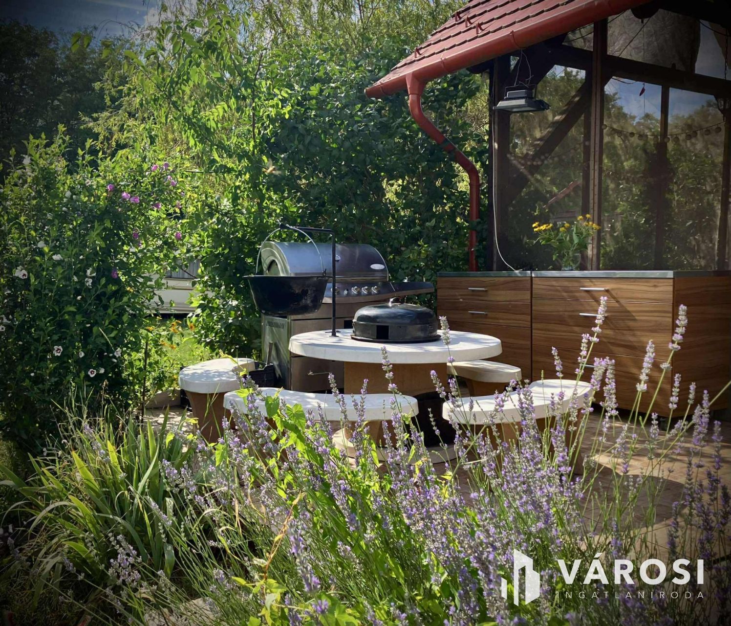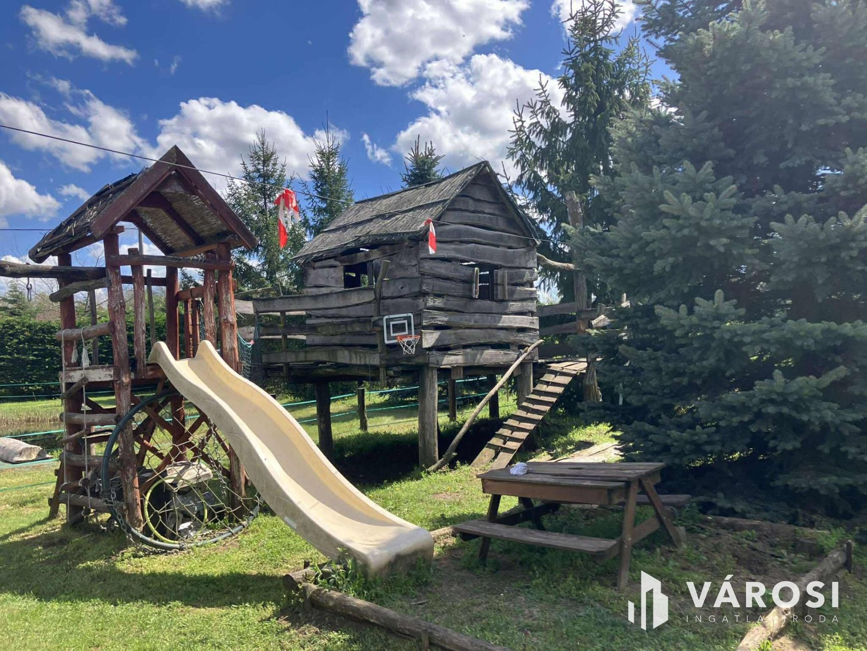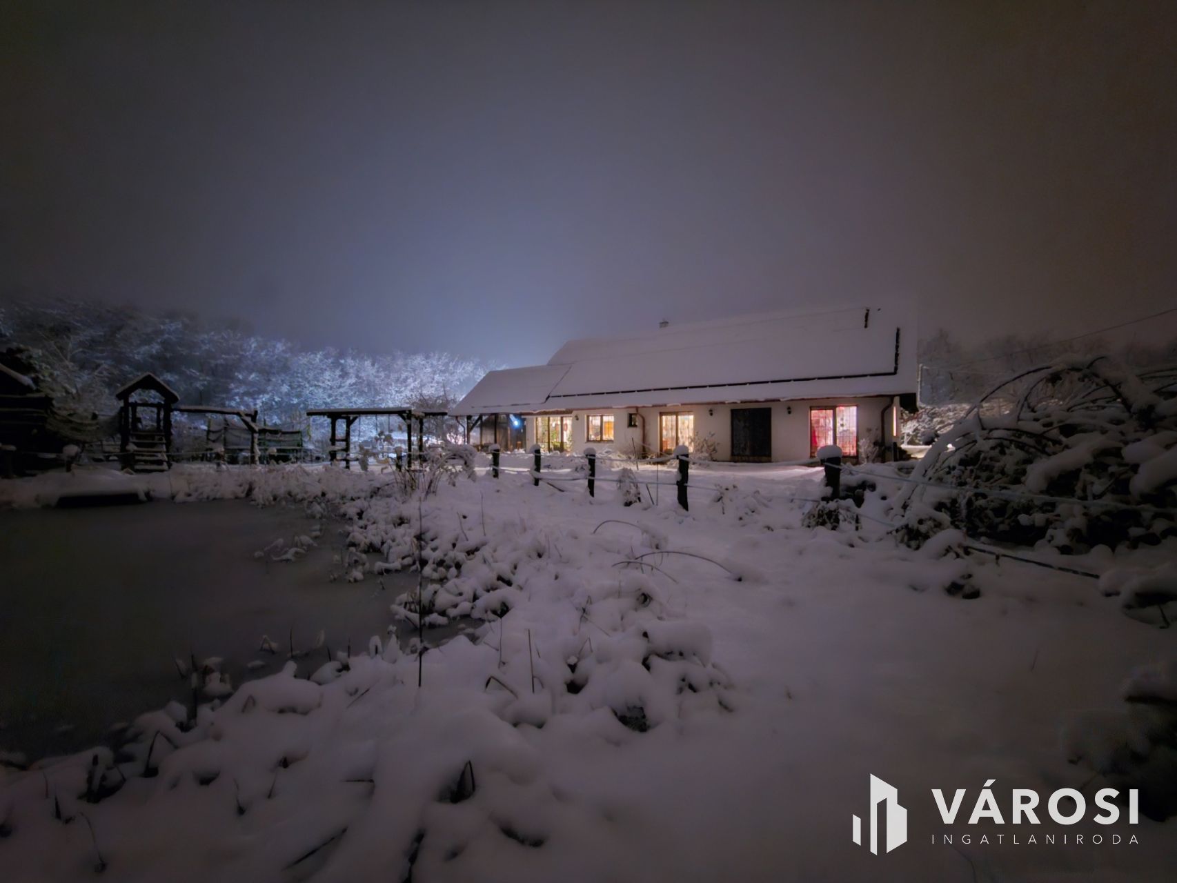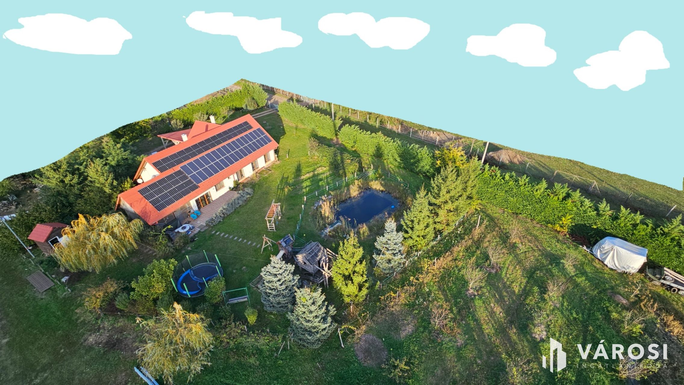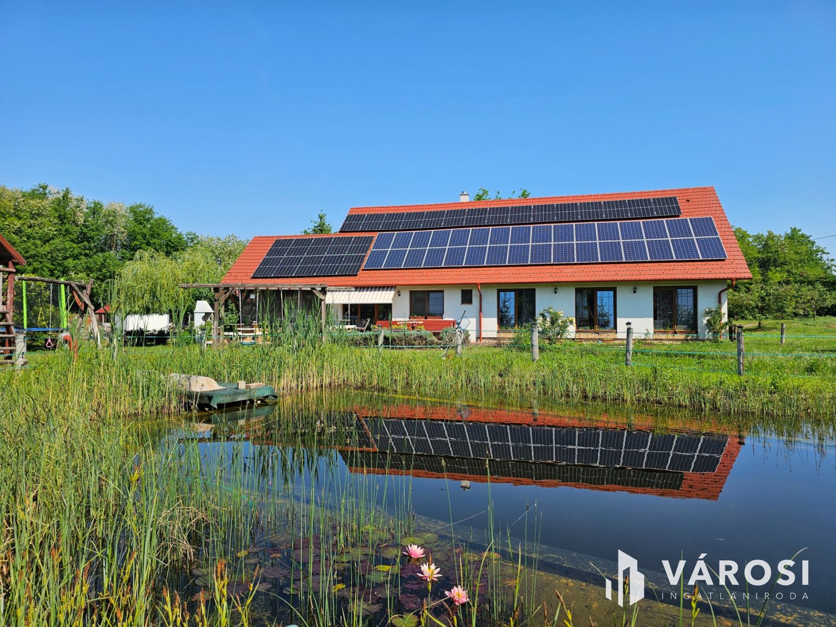 - **Kert és udvar**: Kerti grillezőhely, gyerekeknek privát játszótér, automata öntözőrendszerrel ellátott kert, fúrt kút, kerti tó, stég/móló, melléképület és lakható melléképület, egy nyerges, egy széna tároló, lakókocsibeálló is tartozik a házhoz.