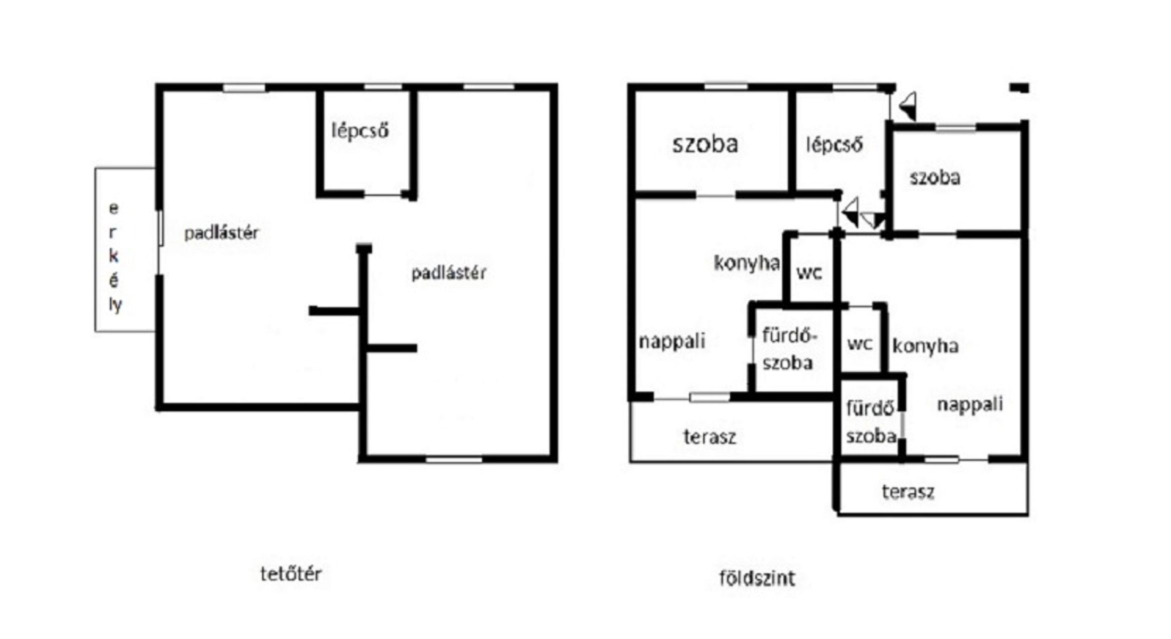 A 74 nm-es, erkélyes tetőté,r szerkezetkész állapotú, befejezésre vár. Igény szerint itt is kialakítható további két lakás, de a földszinti résszel egy egységben további lakószobák is kialakíthatók.