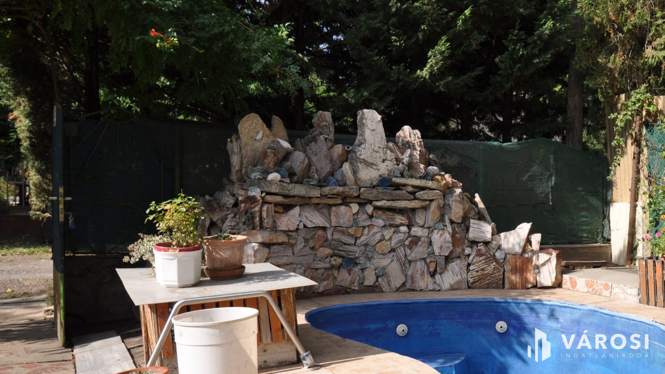 A lakóház mögött tarka színekben pompázó virágoskert szegélyezi a kültéri medencét, mely a nyári hőségben felüdülést kínál az ott lakóknak, és melyhez egy egyedi kövekkel, ásványokkal kirakott csodaszép szökőkút is tartozik.