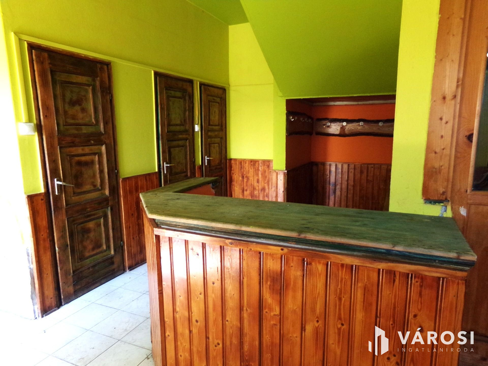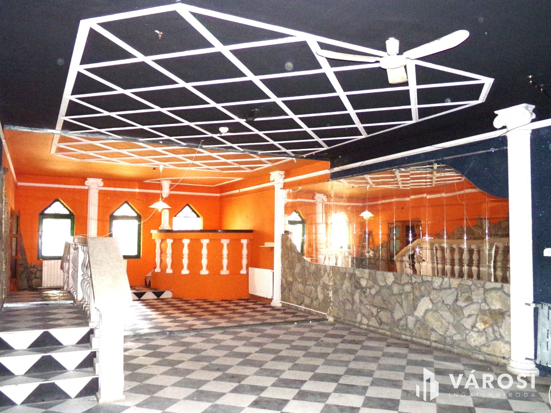 A földszinti rész korábban étteremként üzemelt, ennek megfelelően kerületek kialakításra a helyiségek: előkészítő, konyha, kamra, tárolók, étterem, klubhelyiség, mellékhelyiségek.