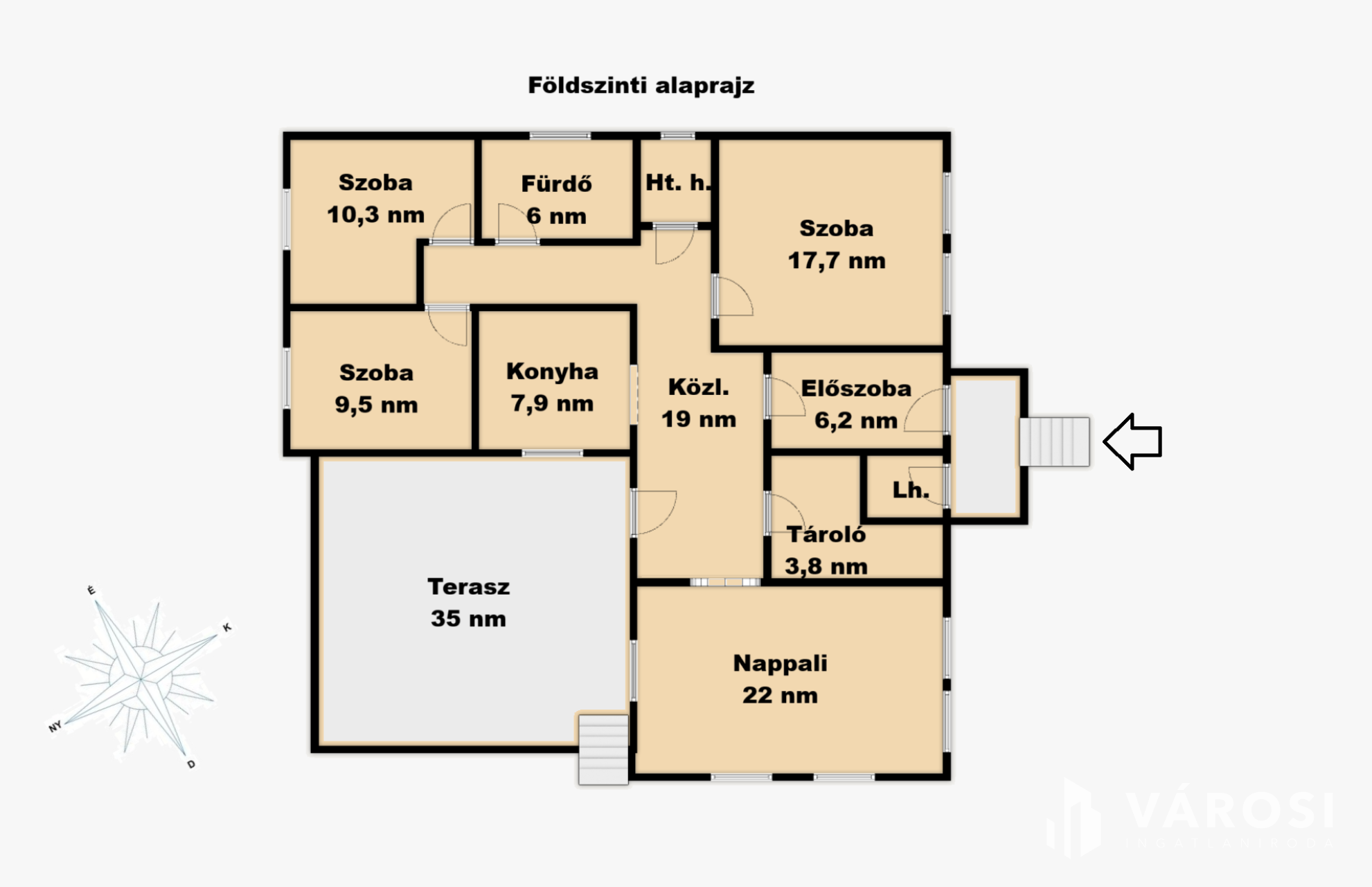 Az épület egy 566 négyzetméteres telken fekszik. A földszinten nappali, konyha, 3 szoba, fürdőszoba, háztartási helyiség kapott helyet 103 négyzetméteren. A ház körbe öleli a délnyugati fekvésű, 35 négyzetméteres teraszt. A teraszon bőven van hely egy jakuzzinak vagy akár egy szaunának is.