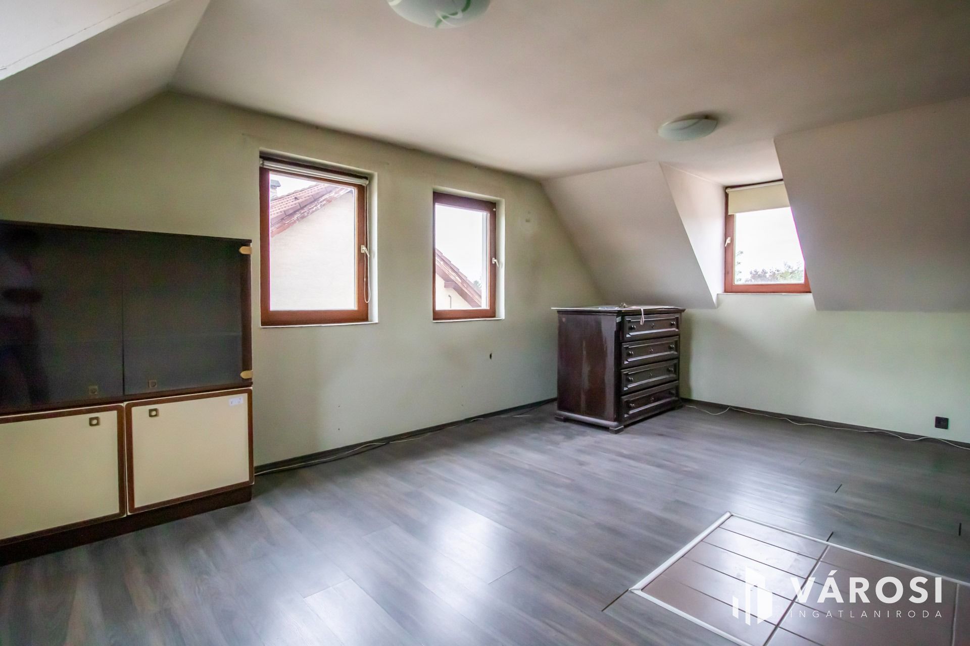 A tágas tetőtérben, további nappali, 3 napfényes szoba, 1 félszoba, konyha, fürdőszoba, wc helyezkedik el, 103 négyzetméteren.