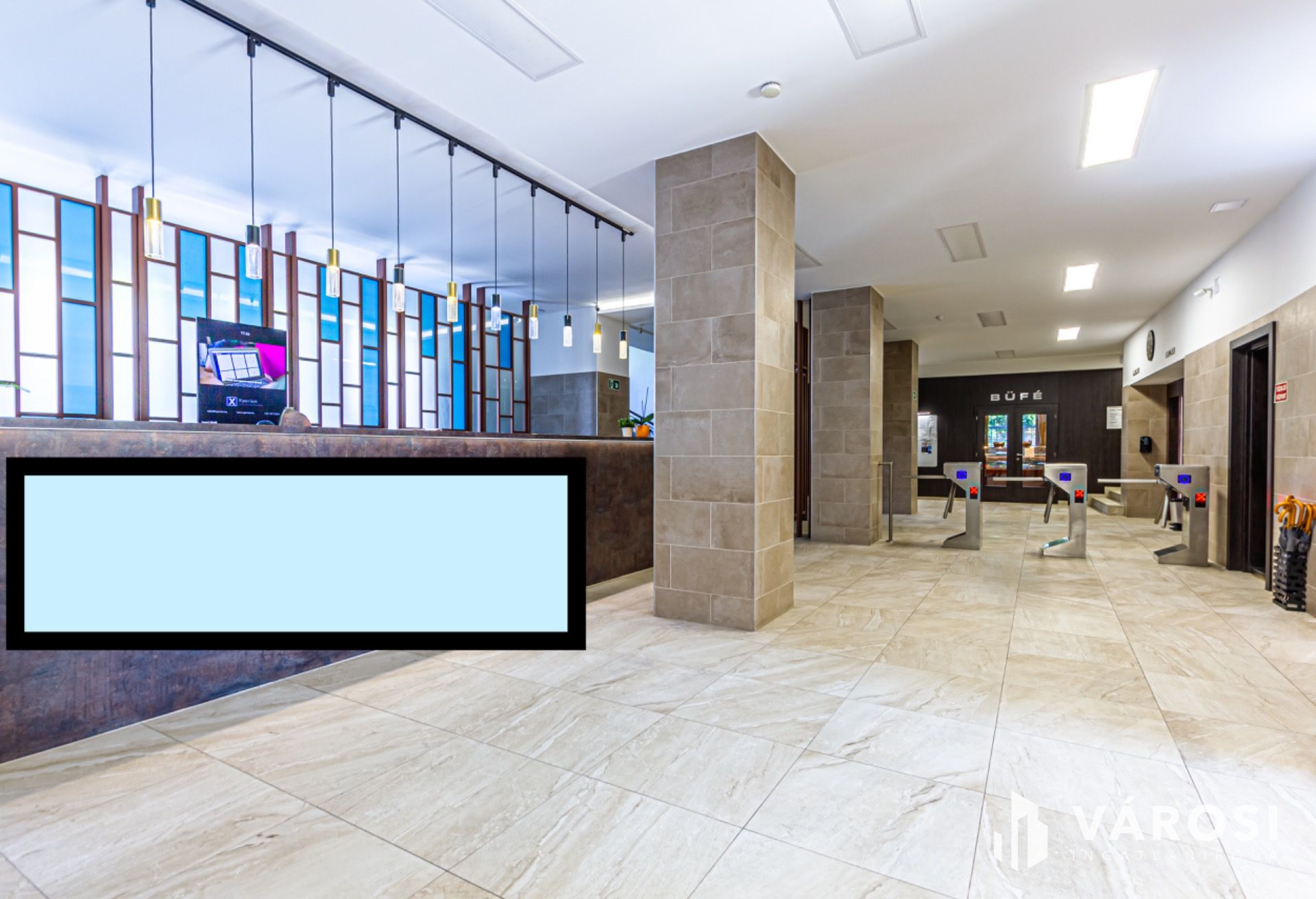 A frissen felújított, modern előtérben elhelyezett kártyás beléptetőrendszer hozzájárul cége biztonságához. A recepció vendégei fogadásával, üzenetek továbbításával, levelei és csomagjai átvételével támogatja az Ön munkáját.