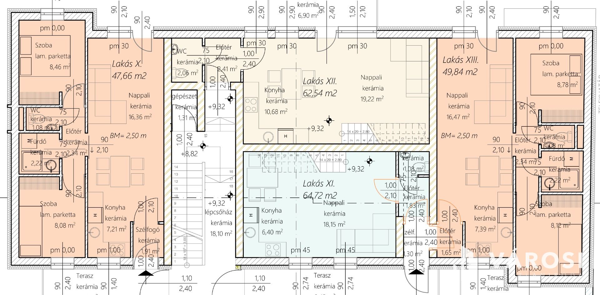 A lakások központi elhelyezkedésűek, közelben bank, posta, ABC,
