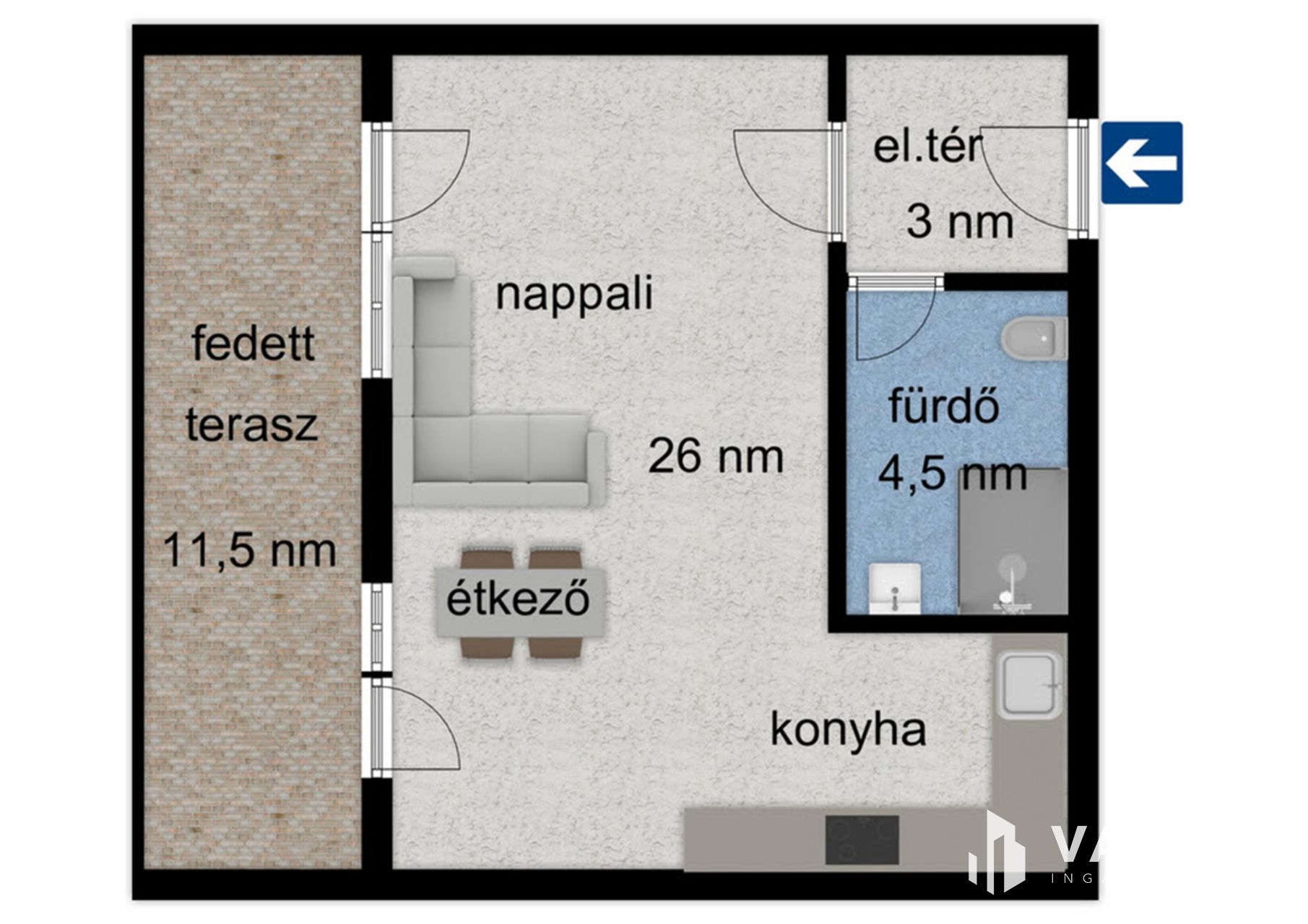 - 33,85 nm lakótér + 11,52 nm fedett terasz.
