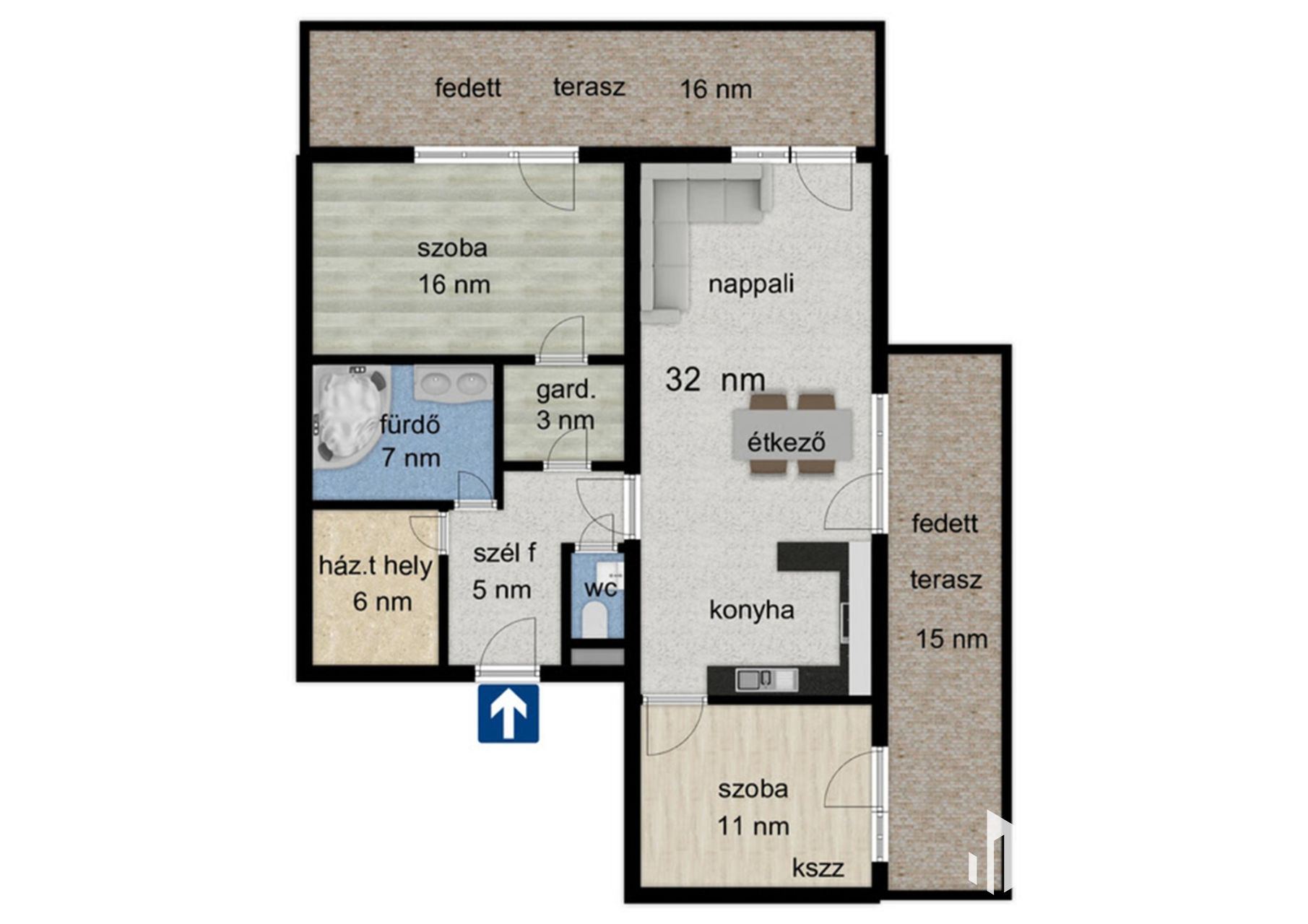 - Nappali, konyha-étkező, 2.szoba, házt.hely,gardrób, fürdő, WC, előtér, fedett terasz.
