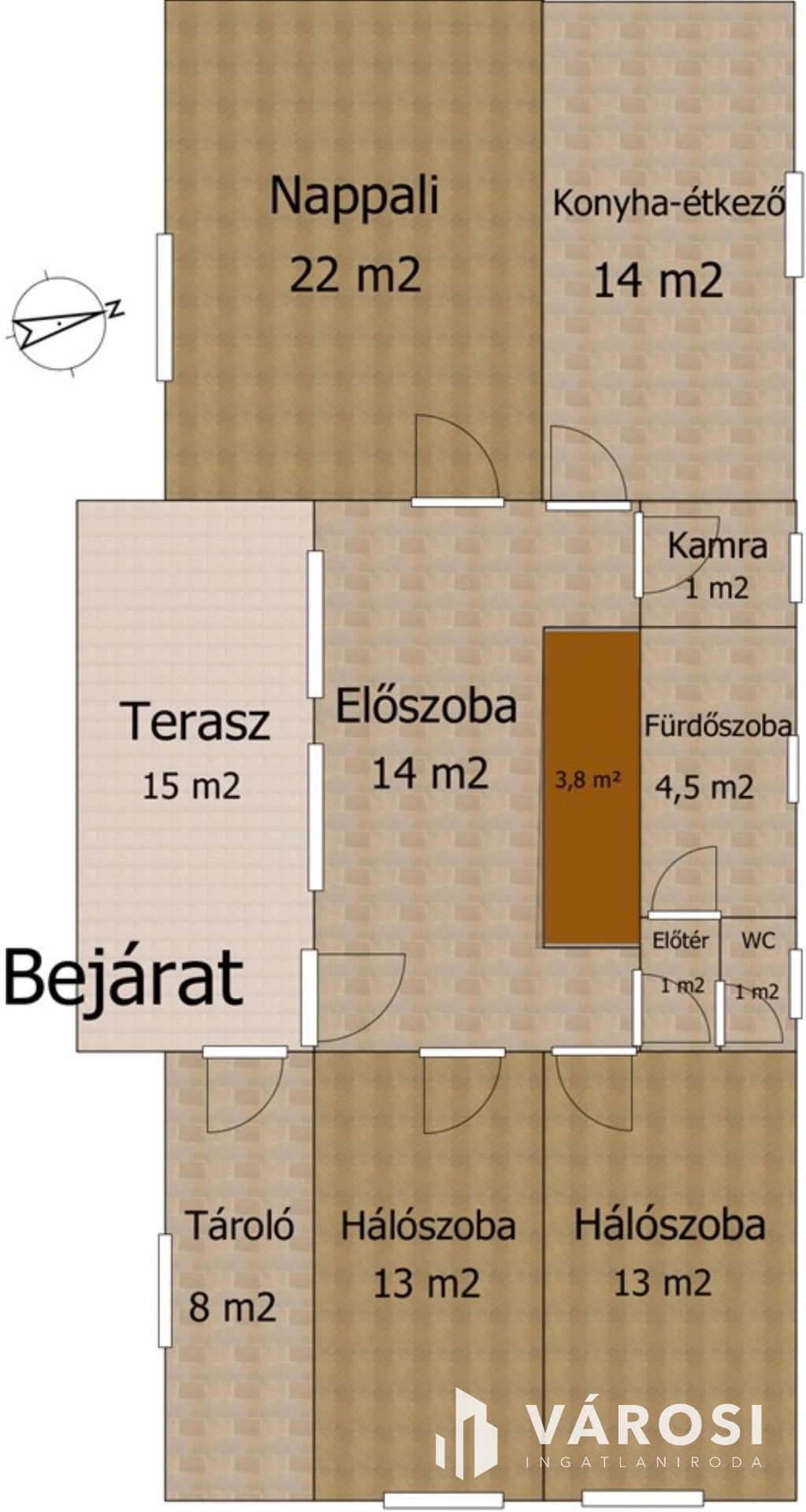 A földszinten a tágas előszoba és a nagyméretű konyha–étkező adja a családi élet központját, ahol kényelmesen elférnek a közös étkezések és beszélgetések. A házhoz tartozó terasz remek helyszín lehet családi vacsorákhoz, baráti összejövetelekhez.