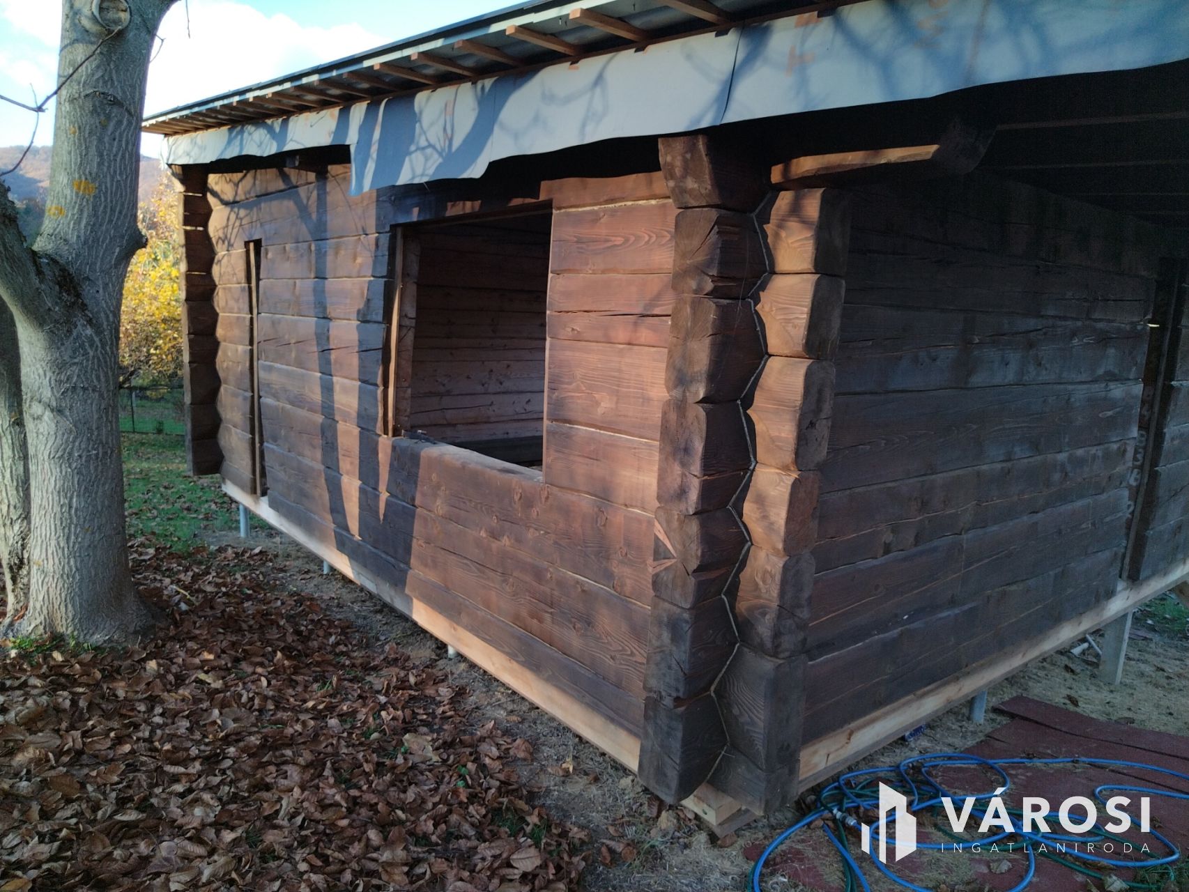 A rönkház szerkezete már készen van, a tetővel együtt. A nyílászárókat, az alsó padozatot, és a mennyezeti szigetelést kell még beépíteni.