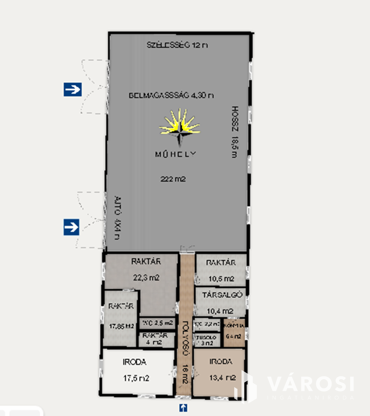Az ingatlan több helyiségből áll, ami az alaprajzon látható. Egyrésze hasznosítható irodáknak, ehhez tartozik konyha, étkező, mosdók, külön férfi-női mosdó, a műhely részleg pedig jármű szerelésre vagy raktározásra alkalmas. Kamion is befér az ajtón 4x4 m-es.
