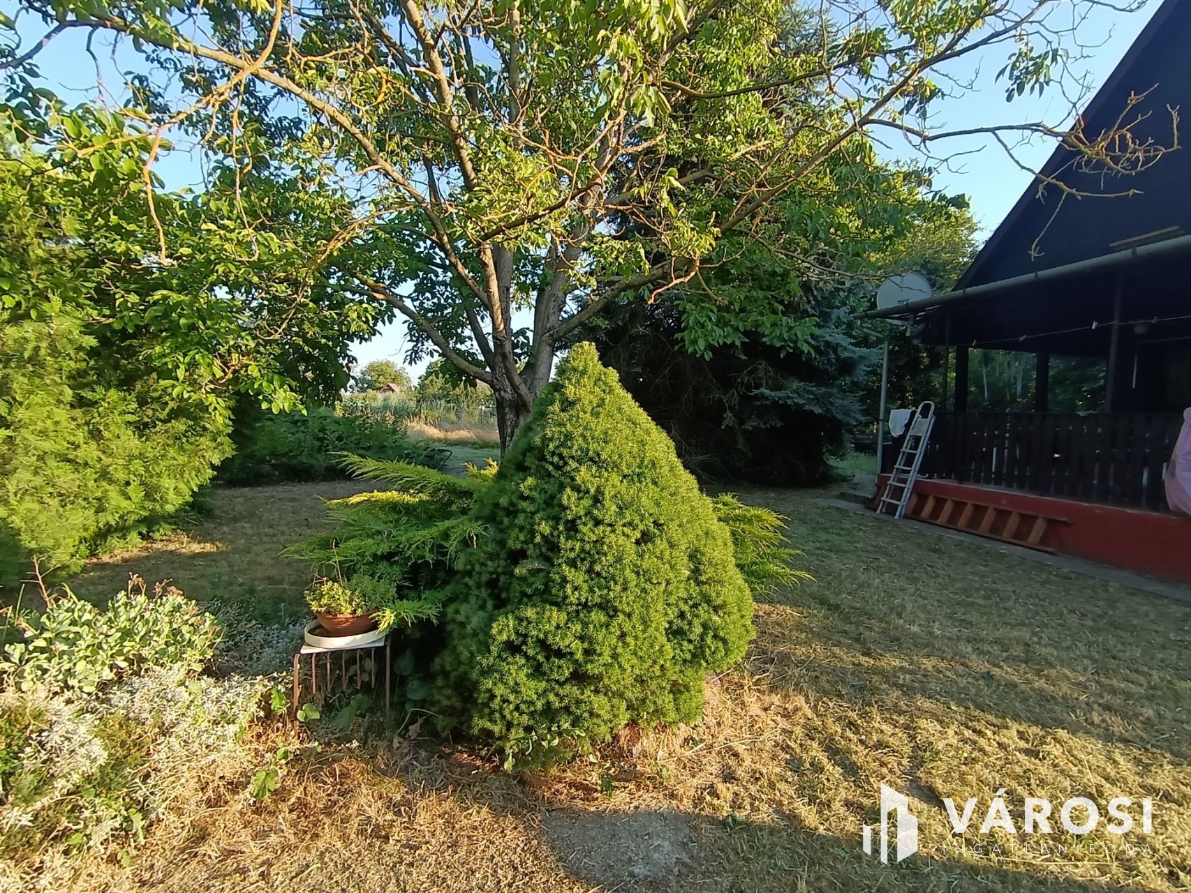 A telek körbekeritett, fákkal beültetett.