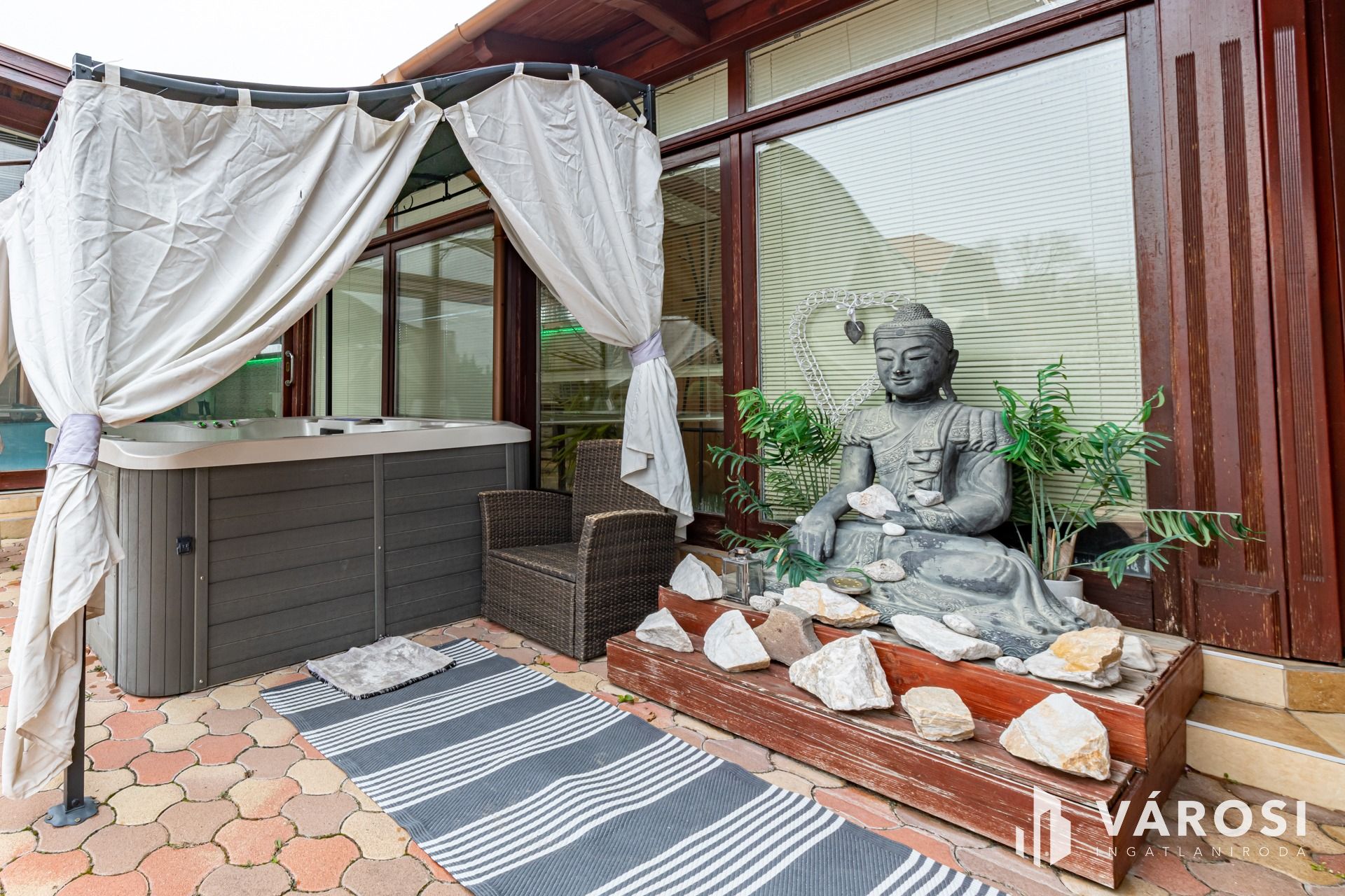 A házhoz rendezett udvar, több autó parkolására alkalmas kerti beálló, elektromos kertkapu, kerti sütögető, napozóágyak illetve egy hatalmas fedett terasz is tartozik, ami egy teljesen felszerelt kinti konyhát és pihenő helyeket is magában foglal. Gyakorlatilag, mintha nyaralna.